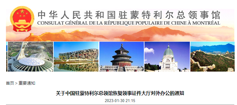中国驻蒙特利尔总领馆发布重要通知,领事证件大厅恢复对外办公。