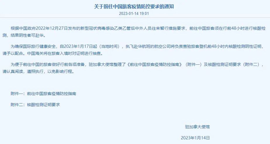 自2023年3月17日东部时间凌晨12点01分起,乘坐从中国大陆、香港或澳门出发前往加拿大的航班旅客,不再需要于登机前提供COVID-19检测结果阴性证明。