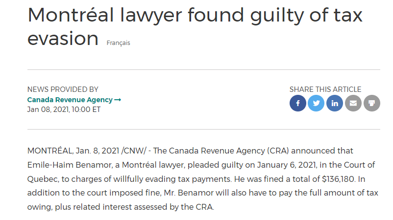 但他的名字警方并不陌生,因为他曾在2021年因故意逃税被处以罚金13万6180加币的罚款,并被被魁北克Barreau du Québec限制从事律师行业。
