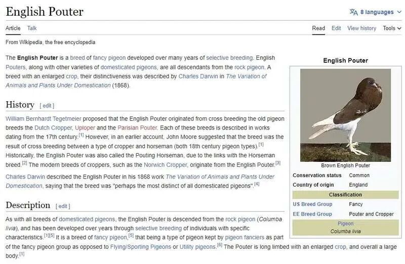 达尔文曾在他1868年的著作《驯化下动植物的变异》中描述了英国Pouter,称“这可能是所有家养鸽子中最独特的一个品种”,“四肢修长、身体肥大”……
