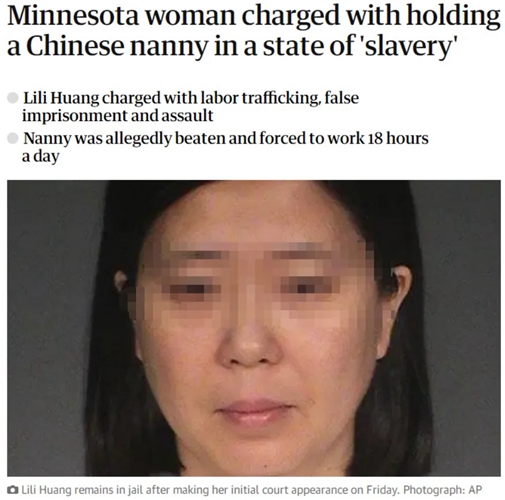 女子说,她叫X(法庭文件没有披露该女子的姓名),58岁,2016年3月从中国来美做保姆。其雇主也是华人,35岁,名叫Lili Huang(音译:黄丽丽)。X跟随黄丽丽一同入境,回家后,X便被黄丽丽“一直囚禁、殴打和虐待”。