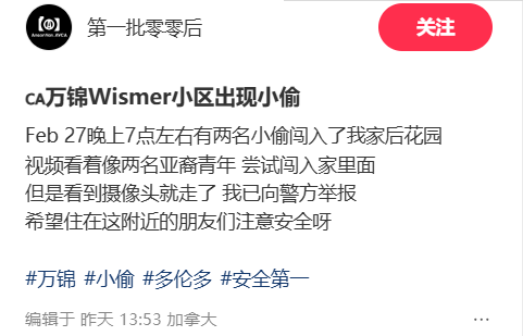 据华人网友@第一批零零后爆料,2月27日晚上7点左右,两名陌生男子潜入他家后院,试图进入屋内……在发现监控摄像头(红灯闪烁)后,两人迅速离开。