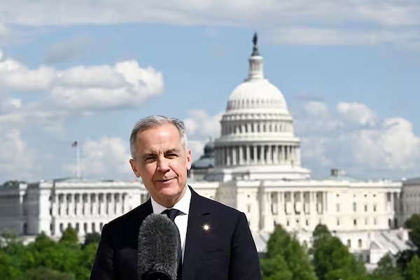 与特朗普会晤后,卡尼以美国国会大厦为背景举行新闻发布会。
