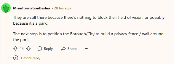 6月26日,北美社交论坛Reddit上一条关于Jarry公园泳池的帖子引发热议。发帖者称,有一群男性进入Jarry公园的公共泳池,目的并非游泳,而是毫不掩饰地盯着泳池内的女性观看。更有甚者,这些人被工作人员劝离后,转移到游泳池外的高地继续围观,行为令人反感。