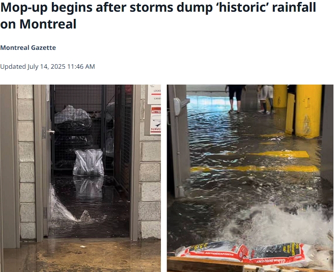 短短数小时内,魁省南部多地降下超过100毫米雨量,蒙特利尔及周边地区瞬间陷入大规模洪灾。超过10万户家庭一度停电,街道变河道、地下室成水池,就连机场航班也被迫延误——仿佛一场“城市水灾大片”在现实中重演。