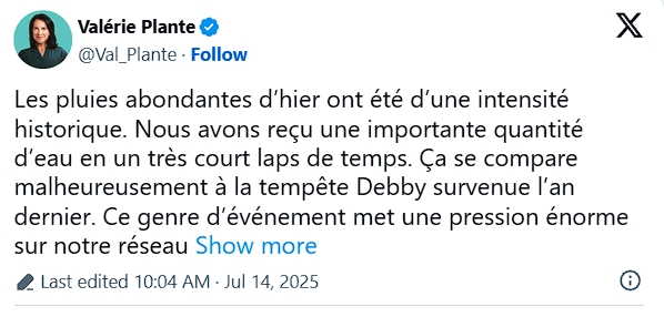面对突如其来的暴雨,蒙特利尔市长Valérie Plante于周一在社交媒体发文,称这场降雨是“历史性的”,并将其与2024年飓风Debby残余带来的强降水相提并论——当年Debby造成了145至175毫米的雨量。