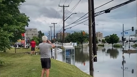 在南岸的Boucherville,IKEA商场的停车场变成一片迷你“湖泊”,大量车辆被泡在水中,市民站在积水边缘拍下视频,无奈自嘲“还不如来游泳”。