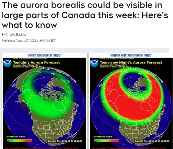 根据预测,几乎整个加拿大都可能观测到极光,仅新斯科舍省和纽芬兰部分最东端海岸线,以及接近格陵兰的极北岛屿处于不可见区域之外。