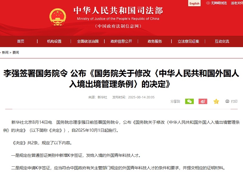 据央视新闻报道,2025年8月7日,国务院总理李强签署第814号国务院令,公布《国务院关于修改〈中华人民共和国外国人入境出境管理条例〉的决定》(以下简称《决定》),自2025年10月1日起施行。