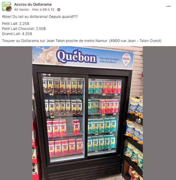 据报,位于蒙特利尔CDN—NDG的一家的Dollarama门店开始销售牛奶产品,包括1升装牛奶及巧克力牛奶,以及不同脂肪含量的2升装牛奶。