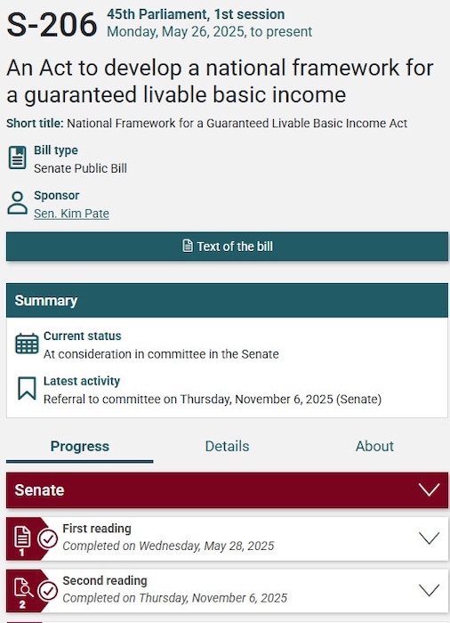 有关“全民可维生基本收入(Guaranteed Livable Basic Income)”的Bill S-206法案二读程序近日在加拿大参议院获得通过,加拿大向“大家拿”方向再次迈出一大步。