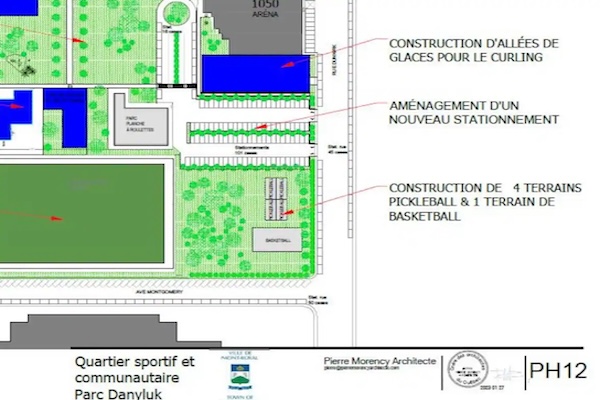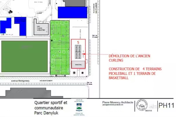 新体育中心规划图,上面可见文字:‘拆除原冰壶馆’。来源:蒙特利尔皇家山市政府(VMO)