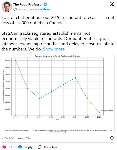 达尔豪斯大学(Dalhousie University)最新一项研究显示,去年全加拿大有约7,000家餐厅倒闭,而到2026年,还将有大约4,000家餐厅撑不下去。