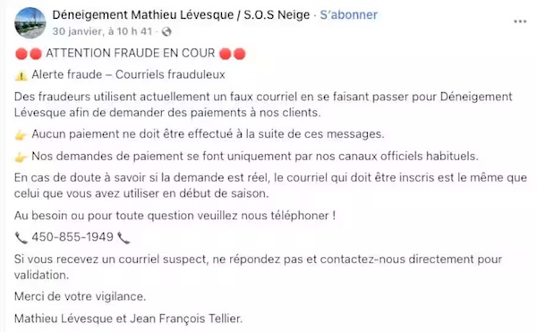 过去一周,来自莱维斯(Lévis)、圣雅辛特(Saint-Hyacinthe)、希库蒂米(Chicoutimi)、布谢维尔(Boucherville)等地40多家除雪公司负责人先后报警,称有骗子冒充他们向客户发送“未付款提醒”电子邮件。