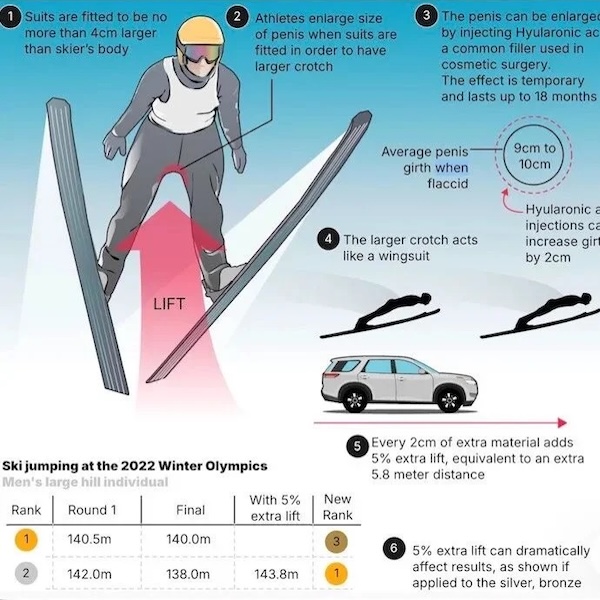几年前,挪威队因偷偷将大跳台运动员的裤裆改大,被国际雪联下令禁赛。、