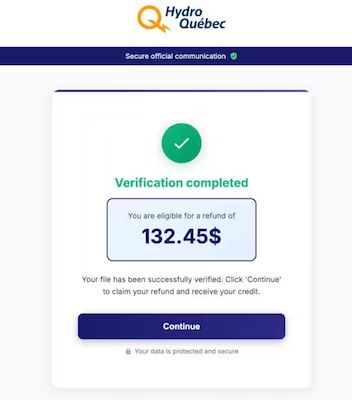 点击链接后,您将进入一个假冒魁北克水电公司网站的页面。系统会提示您点击蓝色按键以验证退款资格。