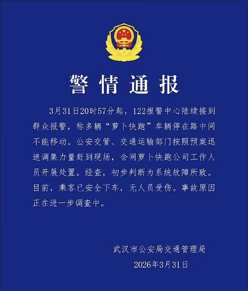 周二晚间,湖北省武汉市地方当局接到大量报警电话,称多辆“萝卜快跑”在路中间意外停车,无法重新启动。