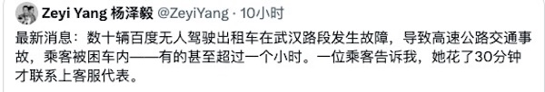一位网友表示,她乘坐的无人驾驶出租车被困在一条繁忙的公路上,她试图使用车内机载平板电脑联系客服,但始终无人接听。她说她被困在路中央超过30分钟。