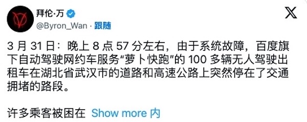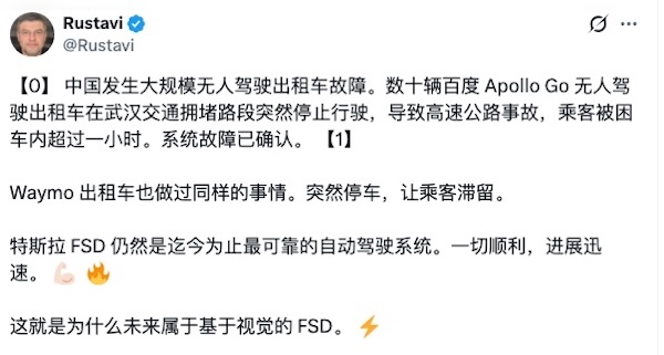 另有评论称,不止百度的Apollo Go,谷歌旗下的Waymo自动驾驶出租车也出现过类似事故……“迄今为止最可靠的自动驾驶系统仍是特斯拉的FSD(Full Self-Driving 全自动驾驶)”。