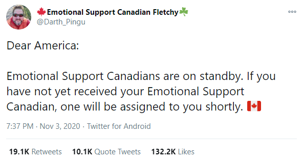 一位推特网友,名叫Emotional Support Canadian Fletchy(治愈系加拿大人Fletchy),给美国人写了一条消息: