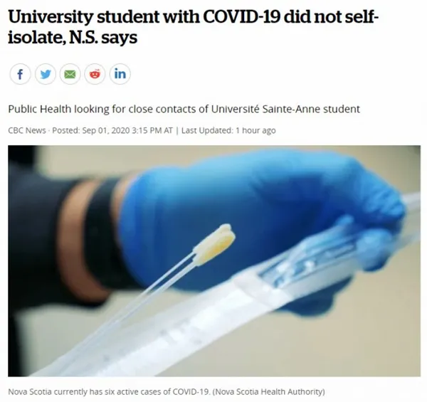 Nova Scotia省政府9月1日证实,一名感染了新冠病毒的大学生没有进行自我隔离就跑回学校。据悉,该名确诊学生就读于圣安妮大学(Université Sainte-Anne)。