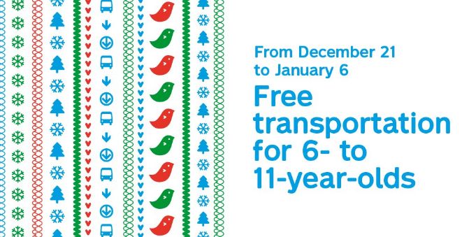儿童免费坐STM 12月21日16点至2019年1月6日16点 5岁以下儿童免费坐STM;1名持有效STM车票的成人可最多陪同5名6至11岁儿童免费乘公交及地铁。