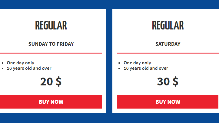 4至15岁的个人单日票,周日至周五每人10刀;周六15刀。16岁及以上的个人单日票,周日至周五每人20刀;周六30刀。