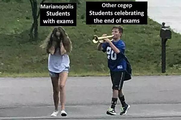 坊间(高中生)之间总流传着Marianopolis的各种八卦:说这里是书呆子的集中营,随便一个人都是学霸,学习压力大的不得了,同学之间互相攀比陷害以拿高分等等。我刚来这个学校的时候充满了对这里传说中各色牛鬼蛇神的恐惧和隐隐的期待,结果来了以后和同一届的新生一聊:
