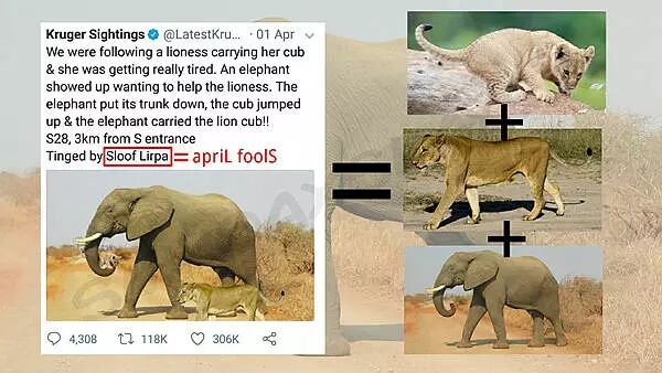 罹患职业病多年的老编追根溯源,结果真相了:照片是P的,最早由一位名叫Kruger Sightings的网友发于4月1日(愚人节),配文大同小异,其落款为“Sloof Lirpa”……将此名反写,即得“四月的傻瓜”(April Fools)……