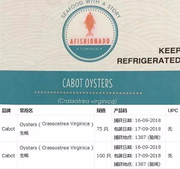 加拿大食品检查局于周一发布公告称:由于产品可能感染沙门氏菌,3301861 Nova Scotia有限公司现召回旗下的Cabot牌生蚝。具体信息详见图片。加拿大食品检查局警告消费者:不要食用该产品,餐厅和宾馆不应再使用该产品作为食材。