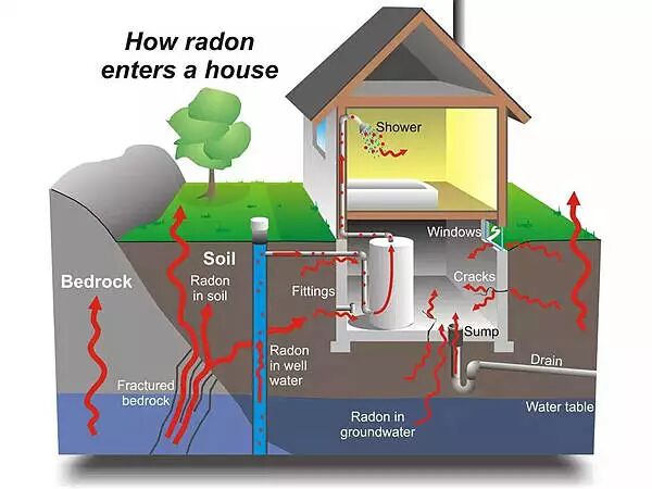 从房基土壤中析出:地层深处含有铀、镭、钍的土壤及岩石,会释放出高浓度的氡。这些氡通过地层断裂带,藏于土壤并最终进入大气层。氡会沿着地表的裂缝扩散进建筑物内。三层以下住房的室内含氡量较高。