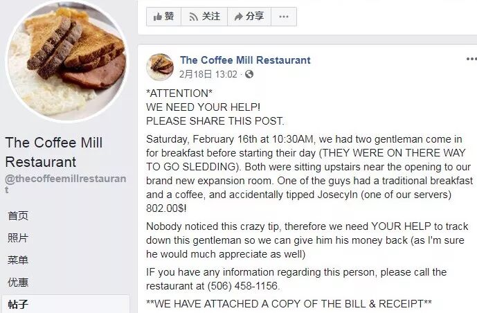 文中写道:“2月16日早上10点半,两位先生一起来吃早饭,其中一人点了传统早餐和一杯咖啡,但不小心给了服务员Joselyn802块小费!希望大家帮忙找到这位先生,我们好把钱还给他。”