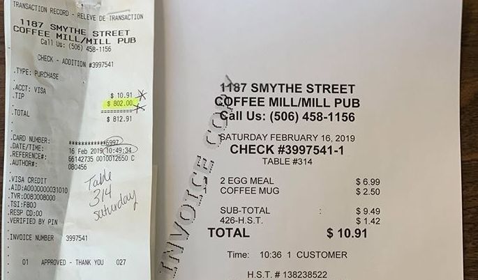 从这位顾客的账单来看,他只是吃了一顿简单的早饭,税后10.91加币。但小费一栏却高达802加币!一共给了812.91加币!