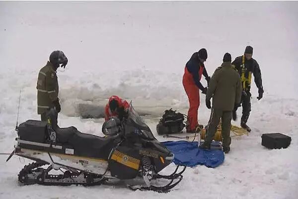 玩雪地摩托坠入河中的母子二人