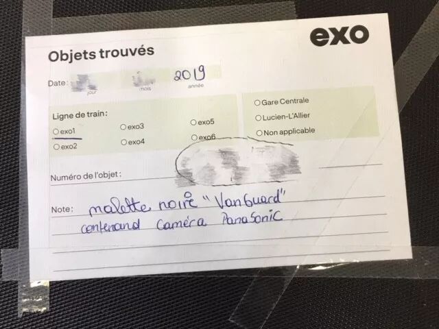 摄像机的箱子上,已经贴上了一个登记单,上面有失物的相关信息,具体有丢失时间,火车线路和失物描述(法语:一个黑色箱子,里面是松下摄像机)。