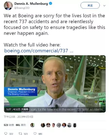 同时,Muilenburg还向波音737客机中的遇难者和家属表达歉意和慰问,并表示波音将不惜一切专注飞机安全,以确保这样的悲剧不再发生。