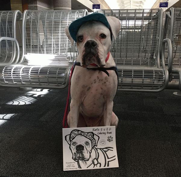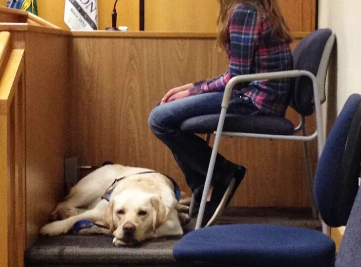 当然了,一般来说,尤其是那种一对一的服务关系,绝大多数还是以“大众型,好调教”的动物为主,狗子占了里面的90%还要多。 工作不分高低贵贱,此类工作类犬也一样,有了认证的情感陪护类宠物证书,他们可以和主人一起出入商场饭店,酒店机场,乘高铁坐飞机,和轮椅拐杖眼镜一样,被视为是生活中必不可少的一部分。每月还根据体型年龄和需要的程度,由政府发放补贴,尽管不多吧,但是狗粮钱基本能够持平。 很心动有木有? 但是其实要拿到这类的资格认证,并不容易。首先主人必须得到医生的证明,的确有相当程度的心理障碍,比如创伤后综合征,抑郁症,自闭症等等,要有工作动物的陪伴才能够正常生活。 然后动物本身,也不是只要长得萌,脾气好就行了,必须经过严格的训练和考核,尽管没有像导盲犬,残障人士用的服务犬那么多要求和条款,但是也严苛得足以劝退不少的主人和他们的萌宠: 需要准确地感知服务对象的情绪波动,在出现紧张/焦虑/抑郁等等不正常情绪时,主动走过去进行安慰,求握手,或者舔对方的手以及脸~~~ 要会在服务对象需要的时候,完成拿药,取水瓶,找电话,开灯~~一项或者多项服务性任务。 提醒服务对象服药,在服务对象出现情绪失控自残的时候,向周围的人示警并寻求帮助~~~ 最重要的一条是,服务类动物在任何时候都要保持冷静镇定和绝对服从,人和狗一起抓狂的情况是绝对不允许发生的~~~ 别人家的狗子我不知道,我家里那个成天傻玩傻睡的那头,是这辈子都别想了~~~ 但是咱家笨狗做不到不代表别人做不到,比如这个故事里的主角。 他叫Karl,是条丑萌丑萌的六岁拳师犬。 Karl的工作地点不是机场,但是他工作的地方人们受到的压力和紧张程度却有过之而不及:法院。 而它的服务对象是里面最容易受到情绪创伤的一群:那些年幼的孩子们。 这些孩子们中有的是残忍凶案的目击证人,有的是虐待,性侵等等恶性案件的受害者,他们本来就经受了巨大的心理创伤,但是又不得不站到法庭上,面对凶手和很多陌生人,复述噩梦般的回忆,有时候还不得不经受长达数小时的交叉盘问,提供那些受害细节。 这对于那些幼小的心灵来说,无疑是二次伤害,但是为了将凶手绳之以法,很多时候却又不得已而为之。 哪怕不是那样极端的案件,仅仅是普通的离婚案,那些坐在长椅上,等待法官判决自己到底是跟父亲还是跟母亲生活的孩子们,感受到的恐惧和不安也足以在他们之后的生活里留下阴影。 比起法官,警察,检察官这些站在正义一方,但是却依然必须按照规则行事的成年人,也许最能给他们带去安慰,抚慰他们心灵的,就是这些不会说话的工作犬了。