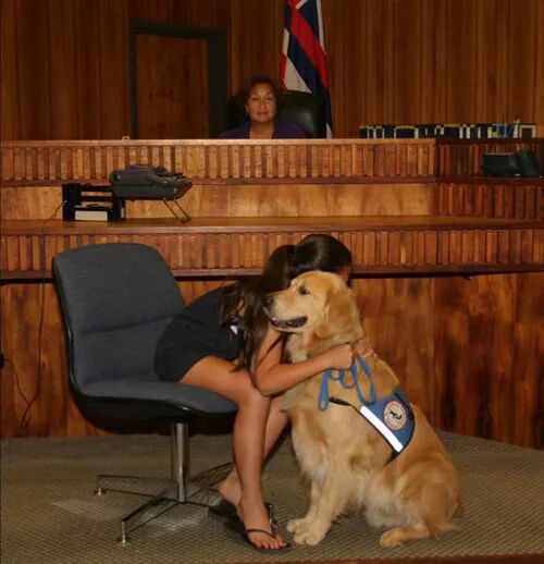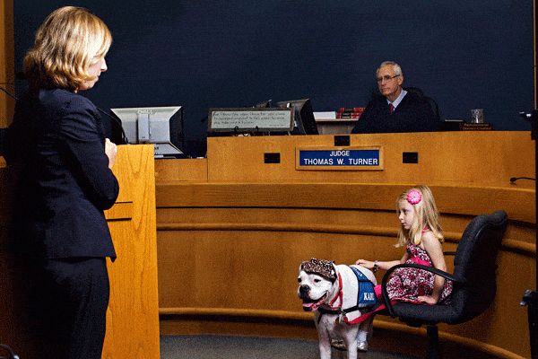 谁说只有孩子需要,判案的间隙,黑袍法官一样撸狗!! 可别小看了这些工作犬,他们不仅需要有之前提到过的那些“精神慰藉犬”必须具备的一切任务能力,还需要具有对服务者情绪的预判能力,在出庭的过程中,如果狗突然站起来,在孩子周围转圈和摇尾巴,那就意味着孩子的情绪很可能已经快要到达临界点,法官必须做出决定暂时中止庭审,给证人时间平复心情。 在加州,这些特殊的法庭工作人员,多半都和Joanne Rittenhouse有关,她是一个有近三十年经验的职业训狗师,在她看来,一个好的情感慰籍犬,跟品种,年龄,身体条件都无关。狗的品性和训练员的爱心和耐心,才是成就这一行的关键。 于是她一般选择的,多半都是别的训练员在培训过程中淘汰下来的无法进行缉毒,导盲等等高端工作的犬只,还有小部分是救助的流浪犬,甚至是有生理缺陷根本无法找到主人的狗。 而拳师犬Karl,无疑是这里面最有挑战性的一个。 因为它先天性双耳失聪,是聋的!!! 比起其他的动物来,其实狗的视力并不是很好,而且天生严重色弱,所以他们对外界的感知主要是来自于灵敏的嗅觉和听觉,没有了听力的狗,别说是成为工作犬了,根本连它自己的生活自理都很成问题。 而对于训练师来说,这更是一个不可能的任务:试想一下,一条连自己的名字都听不见的狗,怎么可能把那些复杂的任务和口令整明白? 但是Joanne第一眼看到Karl,就决定要接受这个挑战。Karl有一双温柔纯良的眼睛,天生和人尤其是孩子有特殊的亲近感,而且最重要的是,它的这个严重的生理缺陷,却可能变成一大长处: 法庭其实有时候会是非常喧哗吵闹的,尤其是控方辩方掐到激烈处,怒气上扬,情绪激动,说话声越来越大是正常情况,咆哮怒吼,拍桌子砸水瓶时有发生,加上法官也不是吃素的,惊堂木/法官锤砰砰砰一阵猛敲~~~ 旁听的人都能惊一个跟头,更别说完全听不懂这些人在吵吵什么的狗了。 装聋作哑保持冷静,是法庭工作犬的基本素质,也是最难做到的一点,但是对于天生啥也听不见的Karl,就容易多了,它可以全身心的把注意力放到服务的孩子身上,完全不受外界声音的干扰。 为了训练好Karl,Joanne甚至自己还专门去夜校学习了手语,放弃了传统的训狗方式,用肢体语言和手语来一点点的教导它。 正常的工作犬,一般八个月到一年就可以完成训练出师,聋了的Karl花了超过两年,这里面的付出和艰辛可想而知,但是它最后还是完成了这个不可能的任务:它不仅拿到了情感慰籍犬的证书,还学会了一百一十多个手语词汇~~~ 在加州法院服役的四年多时间里,Karl服务的孩子超过五百多人,是个明星工作犬。 这里面也包括了一个四岁的小女孩。 因为涉及到未成年人的隐私,这个孩子的名字和案件的具体细节都被隐去了不少,只知道她是一起严重家庭暴力的受害者,施暴的是她母亲的男友。这个女孩被殴打,虐待,性侵,不仅如此,那个禽兽不如的凶手还将她两岁的弟弟虐待至留下了终身后遗症。 事情发生以后,女孩的母亲作为同谋之一,拒绝上庭指证凶手,于是这个孩子成了案子唯一的证人。 尽管已经被安置到了一个很有爱心的寄养家庭,女孩还是患上了非常严重的创伤后心理综合征,她不愿意出门,怕黑,怕呆在一个封闭的空间了,更怕和陌生人接触。 在开庭前的一次听证上,女孩和社工来到法院,这是她在案发以后,第一次看到那个对她施暴的凶手。 刚刚一开门,看见那个带着手铐的男人远远地坐在那里,她的情绪马上就崩溃了,她开始大哭,却连站起来的力气都没有,整个人瘫软在走廊里,不管社工怎么劝说,她都坚决不进去。 这时Karl和它的训练师刚好路过,它走过去,用鼻子闻了闻还在哭泣的孩子,用舌头舔去了她脸上了泪水,然后靠在她身边躺了下来。 神奇的一幕就这样发生了,尽管女孩还是拒绝进屋去参加听证,但是她却慢慢地平静了下来,她用手指梳理着Karl的毛发,玩着它的耳朵和爪子,似乎已经完全忘了自己身在法庭,跟普通小姑娘一样跟这个大狗狗玩了起来。 几天以后,又到了去法庭的日子,她像之前一样哭闹着不出门,无计可施的社工突然灵机一动:我们不去干别的,就是去看看狗狗Karl好不好? 听了这话,小女孩马上就不哭了,她拿起自己的帽子,露出了笑容:那好,我们去找Karl玩。 在Karl的全程陪伴下,她终于第一次在检察官面前完整地给出了自己的证词。 看到了这一幕,训练师Joanne决定,让Karl来担任她的情感慰籍犬,不仅仅是在庭内,庭外如果孩子需要,Karl随时可以过去陪她玩。 慢慢的,这个孩子变得开朗起来,她不再害怕出门,她带着Karl去公园,像其他孩子展示这个温柔的大伙伴,在她的世界里,不再有那个伤害她的凶手的影子,取而代之的,是久违了的安全感。 不久以后,到了开庭的那一天,她和Karl一起坐到证人席,长达三天的作证过程中,她勇敢地面对了那个男人,向法庭描述了他的种种暴行。 在这个过程中,社工目睹了让人眼眶湿润的一幕: 狗狗Karl在小女孩的脚边睡着了,她想要去摸摸它,但是又有点够不着,她又不忍心拉牵引绳把狗狗叫醒。于是她偷偷地脱了自己的鞋子,光脚在它的背上蹭了蹭,感觉一下那种毛茸茸的暖意。 感知到了的 Karl醒了过来,它回过头看着小女孩,用舌头舔了舔她的小脚丫,意思是:没事,我在呢。 在庭审结束以后等待结果的这段时间里,Karl也一直和她在一起,在某些不方便带狗进入的场合里,它就会安静的守在门口,等她出来