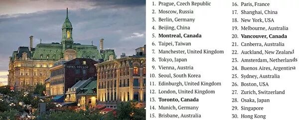 根据AppJobs发布的一项调查,蒙特利尔是北美最好的“学习城市”。该调查基于影响学生体验的一些关键因素,包括兼职工作机会,平均房租,音乐会和表演活动的频率,学校数量,学习和生活平均成本等。报告显示,得益于“租金便宜”(月均911元于全球排名第三)的蒙特利尔最终以总分54.8分拿下全球第5,北美第1。多伦多排名第13,温哥华排名第20。捷克共和国的布拉格得分64.6,夺得全球最佳学习城市榜首。北京第4,中国台北第6,上海第17。