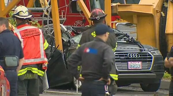 最新消息称,塔吊从Google新大楼上坍塌后下坠,砸到建筑后四分五裂,落在Mercer街;金属构件共砸中六辆汽车,造成四人死亡,四人受伤。