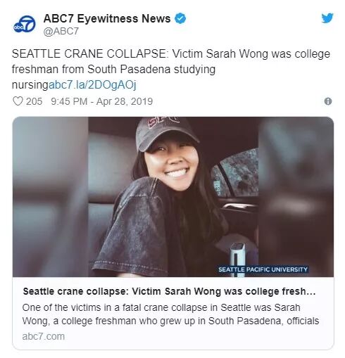 来自美国《世界日报》的消息称,美国西雅图太平洋大学(SPU)28日晚宣布,该校一名新生、护理系华裔女生黄莎拉(音Sarah Wong)当时正好乘车经过,不幸被砸身亡。