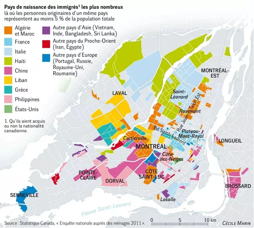 蒙特利尔是全球最为多元化的城市之一,这里不仅融合了英法文化,来自世界各地的移民也都在这里聚居。你知道NDG吗?那里竟然是蒙特利尔最大的菲律宾社区!华人们又都住在哪里?意大利人、俄罗斯人、海地人……点图放大,仔细看,有些地方一定会让人大吃一惊。当然,这张蒙特利尔社区人口统计分布图是由制图师Cécile Marin在2011年绘制完成的。虽然已过去了八年,情况多少发生了一些变化,但总体而言依然如是。无论你是否打算搬家,这张图都很有研究价值……