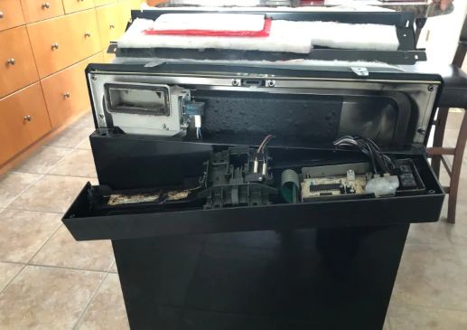 “谁能想到装满水的机器还能着火?!我想,打开洗碗机的门或许能减小火势,可刚开门时,火焰确实没了,但紧接着,一阵电火花闪过,巨量的浓烟瞬间便呲黑了整间厨房!”