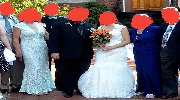 据悉,一名外国婆婆在儿子结婚当天,也穿了一件新娘式的礼服,这令婚礼现场的宾客既尴尬又震惊。婆婆和新娘“撞衫”啦!照片被上传社交媒体后,网友开始七嘴八舌:“完全分不出哪个是新娘,这两件蕾丝礼服实在太像了!”、“新娘的白一些,婆婆的有点蓝……”、“如果这是我的婚礼,我一定翻脸!”、“俩人站在新郎左右,这是一种致命的冒犯!”、“我一定会拒绝合影哒!”……总之,这位婆婆遭到无数网友炮轰,大家最后一致表示:以婆婆的身份在儿子的婚礼抢新娘的风头,这不合适……