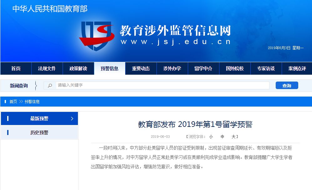 中国教育部6月3日表示,近段时间以来,注意到一些中国学生赴美留学遇到一些障碍。因此,教育部决定发布2019年第一号留学预警。