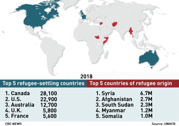 报告显示,2018年期间有25个国家接收安置了92,400名难民。其中加拿大接收的人数最多,为28,100人;美国排名第二,接收了22,900人。