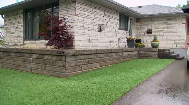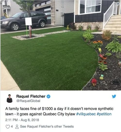 不需维护、不用浇水,不再剪草、只闻花香……由于魁北克城房主Martin Dignard一家患有严重的过敏症……一割草就犯病……于是他在屋前院内种了真花,但却选铺了并不便宜的合成草坪。