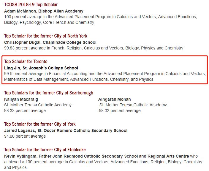 多伦多天主教教育局是加拿大最大的天主教教育局,每年都会放榜各校区、各专业成绩最好的学生。