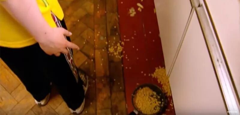 大家也开始讨论分工。于是,男孩们尝试把墙擦干净、把地上的爆米花捡起来,但清理的效果并不理想。