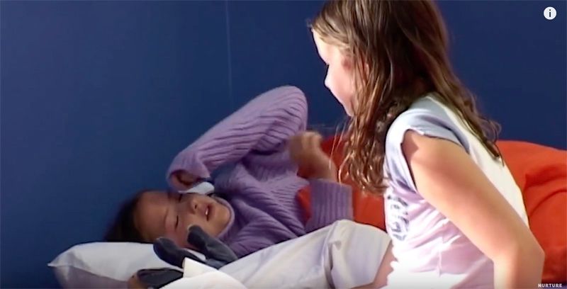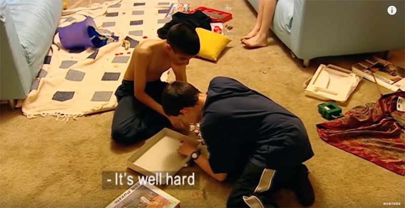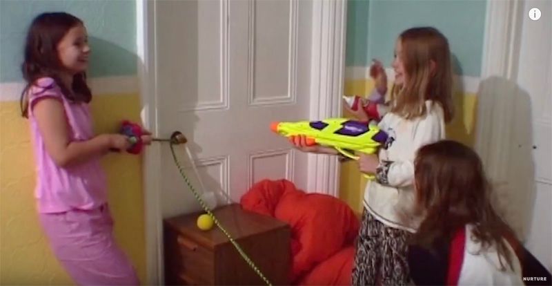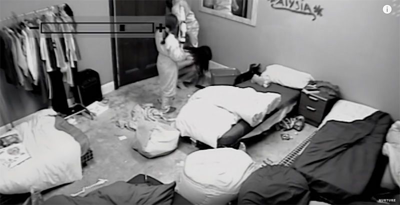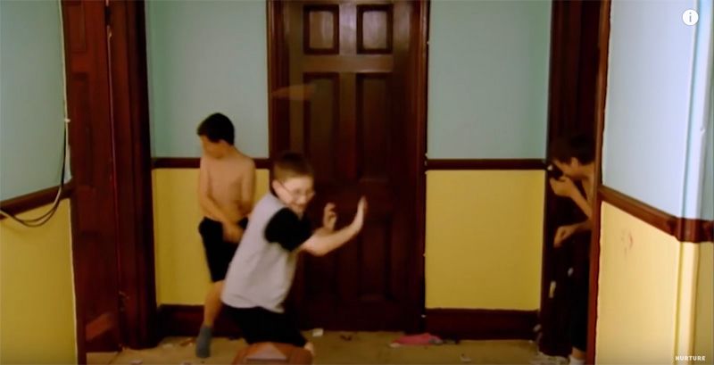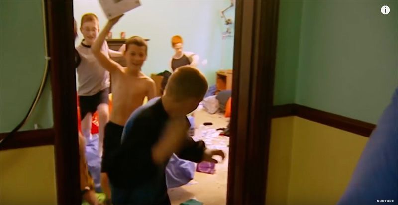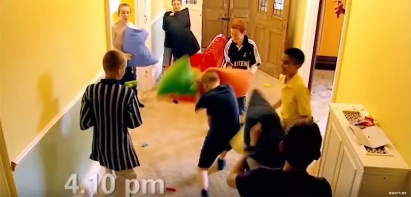 两个房间的男孩都怒了,他们开始阵营鲜明地互扔东西,扔的物品越来越重,把墙都给砸了。还想尽各种方法互相攻击,门一打开,弹珠直接打到脸上。